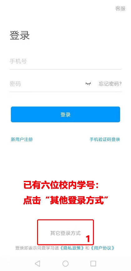 在手机“应用市场”中搜索“学习通”APP。正确安装后,。使用手机号码注册登录。