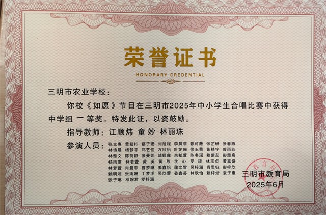 2025年6月30日,由三明市教育局主办的市中小学生合唱比赛中,三明市农业学校女声合唱团以一曲《如愿》的深情演绎,荣获一等奖。